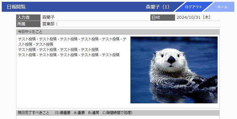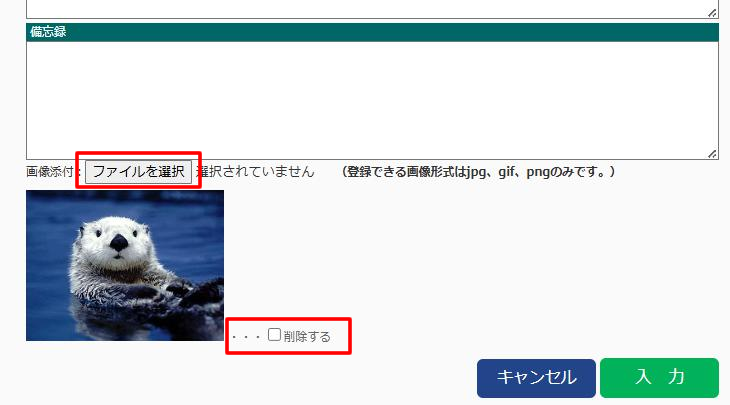 2024.10.23 【PC】日報に画像を登録できるようになりました 最下部の「ファイルを選択」をクリックすると画像を登録することができます。 登録できる画像形式は、JPG、GIF、PNGのみです。 ■閲覧画面登録された画像は、閲覧時に「今日やったこと」欄の右上部に表示されます。 ■編集画面画像を差し替える場合は「ファイルを選択」で新画像を選択します。登録済み画像の削除のみを行う場合は、「削除する」にチェックを入れてください。